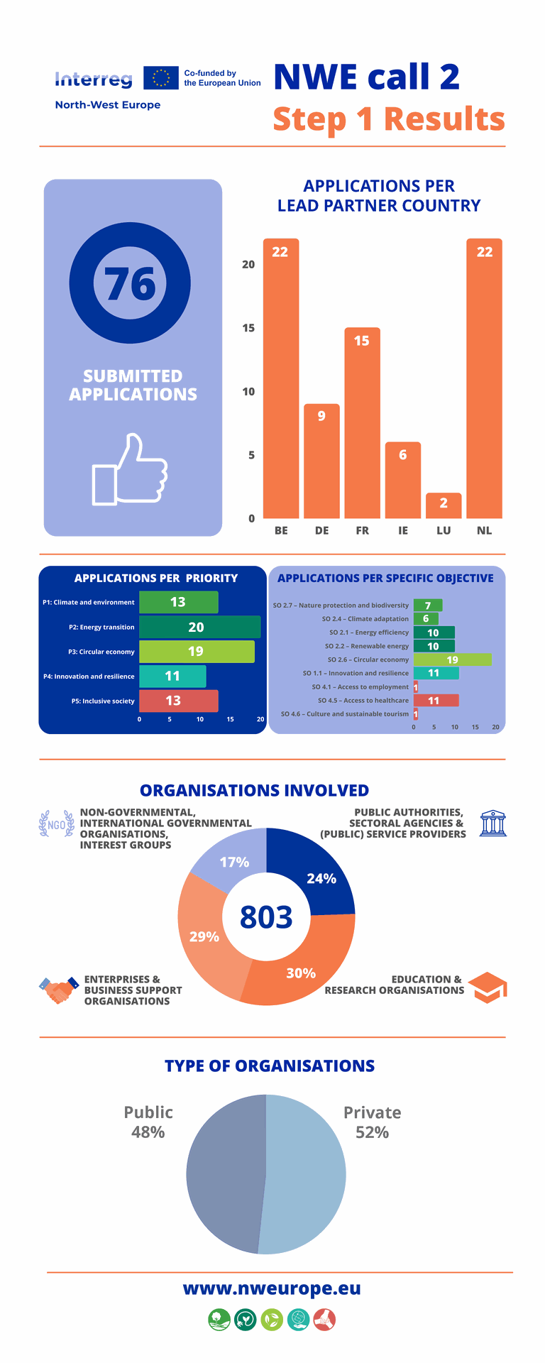 Interreg NWE 2021-2027 Call 2 opened on 14 November 2022 and closed on 9 February 2023. 17 projects were approved in step 2 after the Monitoring Committee meeting on 21-22 November 2023. See below the terms of reference for call 2 and an overview of the call.